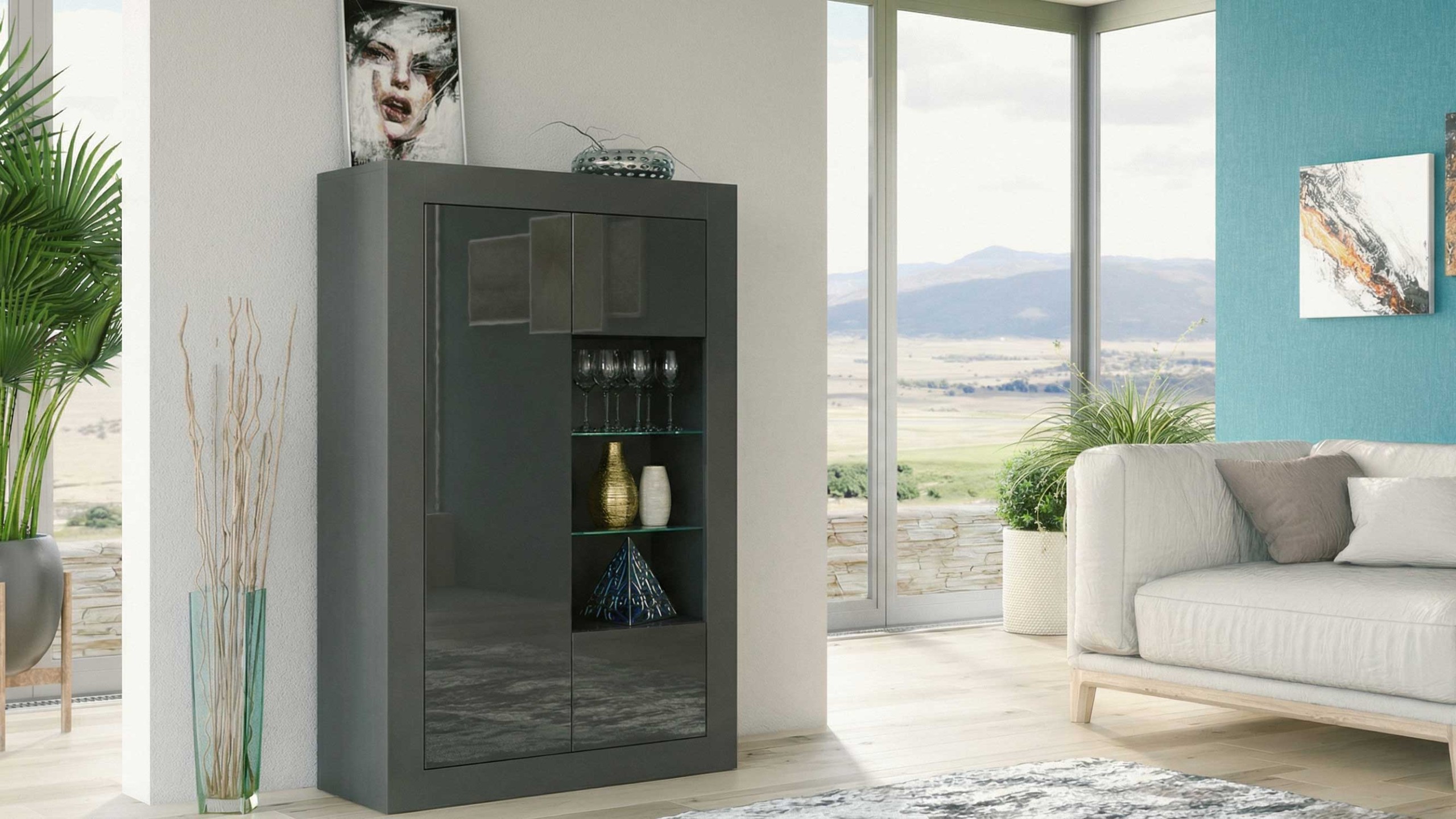 Grey Gloss Display Cabinet 93cm Tall Modern Storage Unit with Glass Shelves