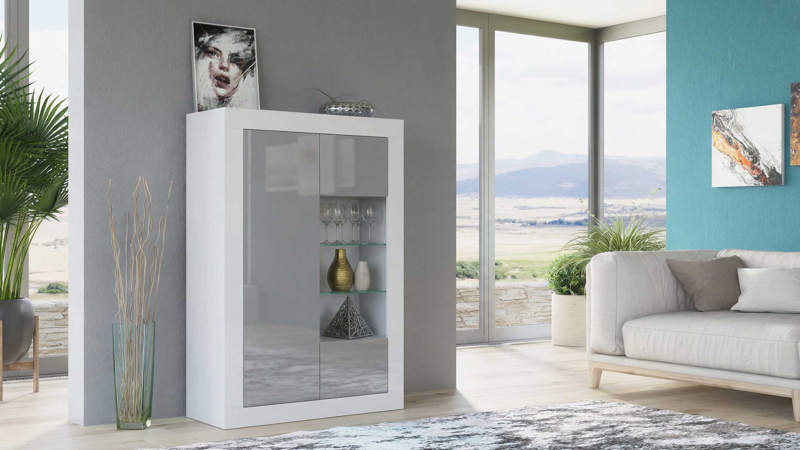 White & Grey Gloss Display Cabinet 93cm Tall Modern Storage Unit