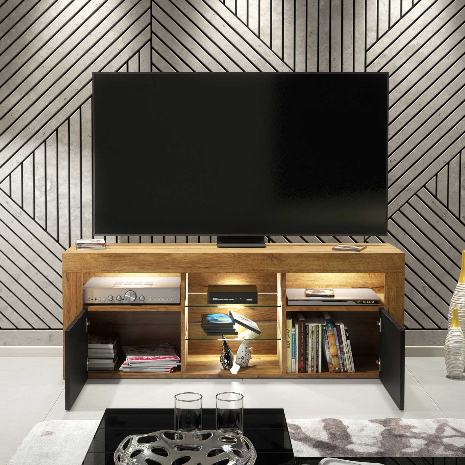 Oak and Black TV Unit 145cm – Modern LED TV Cabinet with Free White Light