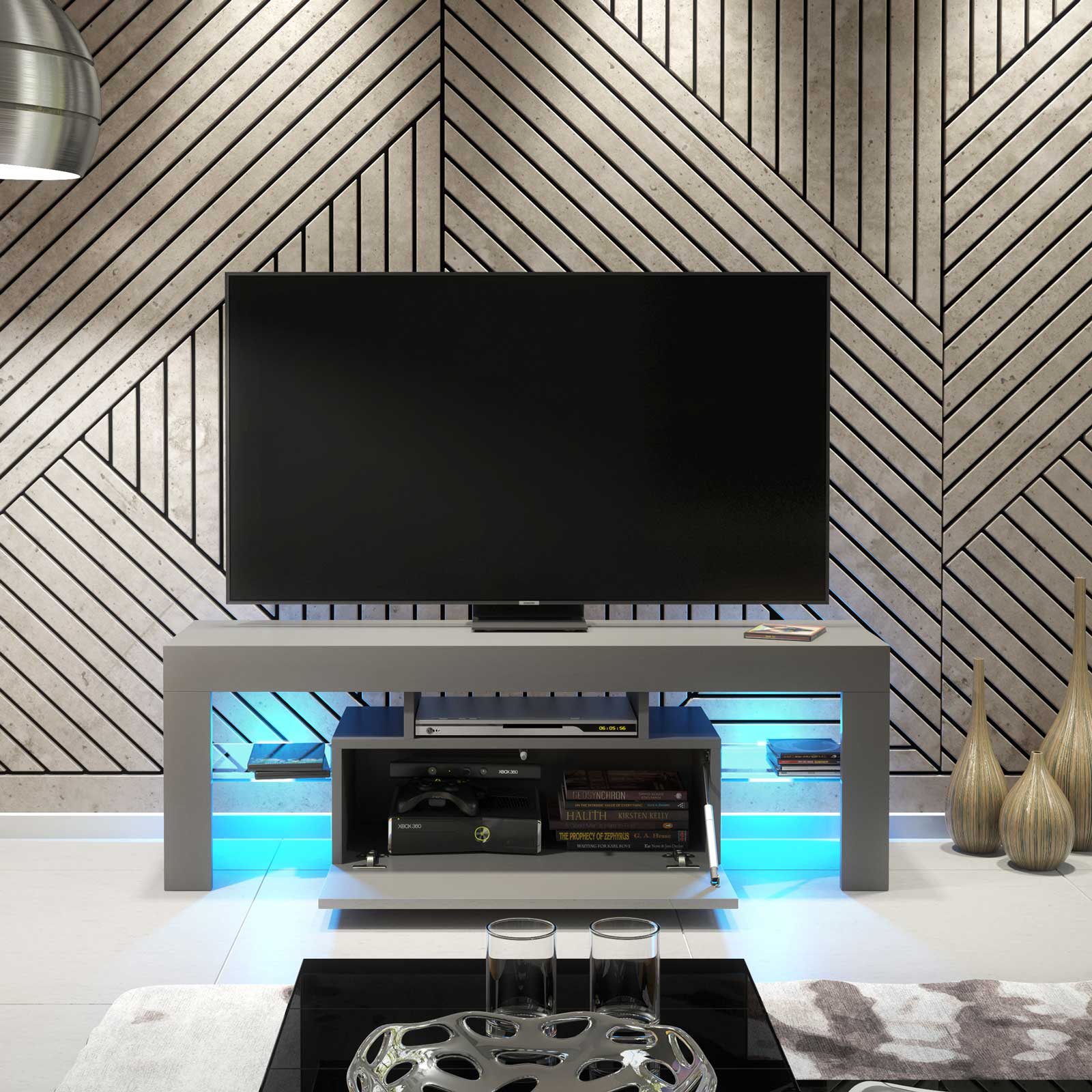 Modern Grey TV Unit with High Gloss Doors & Free LED – 130cm Cabinet