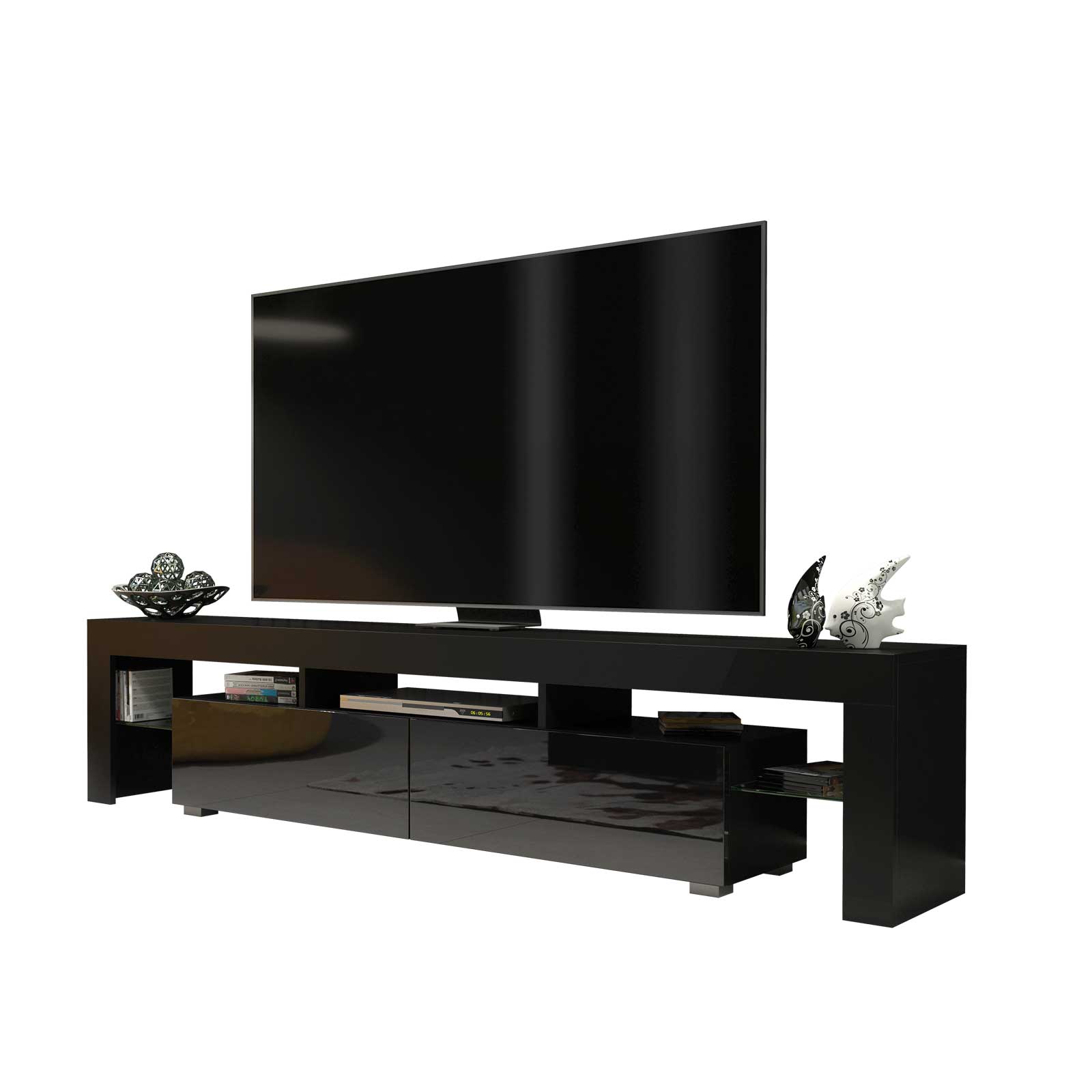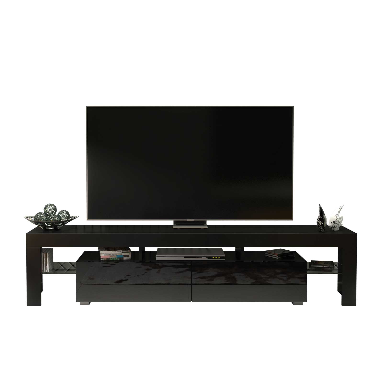 This unit includes two spacious compartments with flip-down gloss doors that open to reveal concealed storage for media players, game consoles, remote controls, or accessories. On either side, two open shelves with glass panels provide a perfect spot for displaying decorative pieces, books, or small electronics, keeping everything organized and accessible.