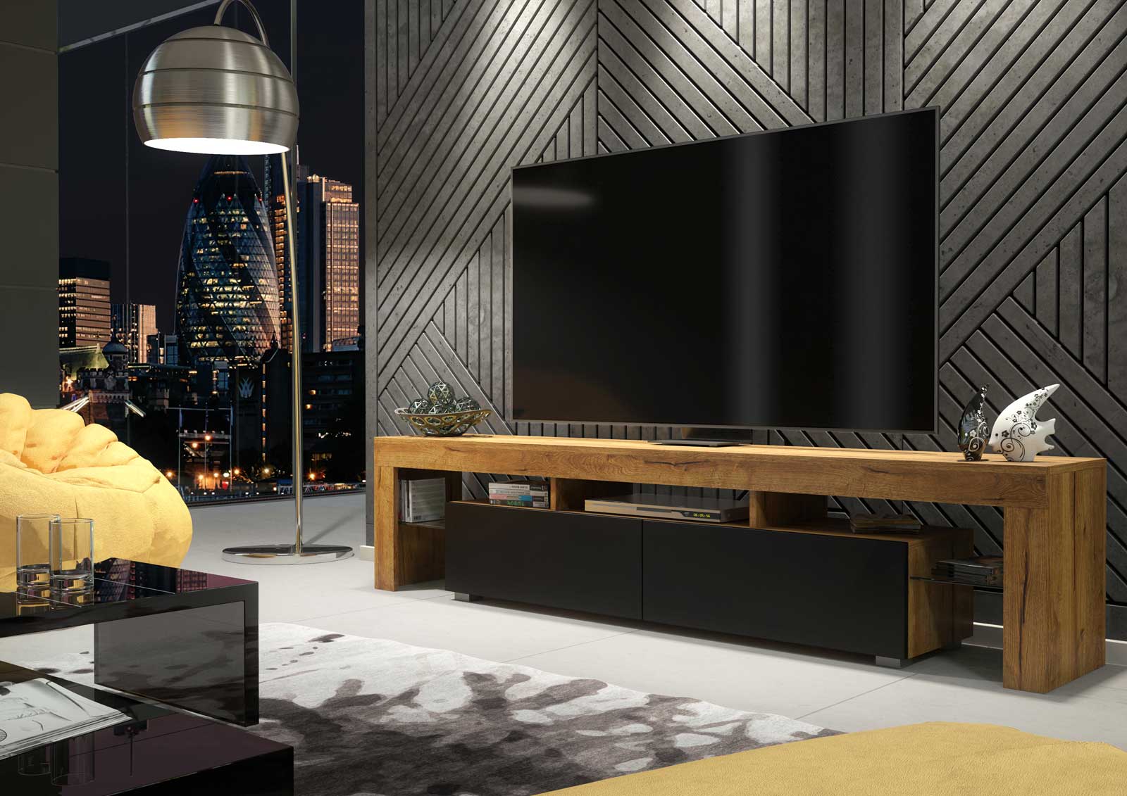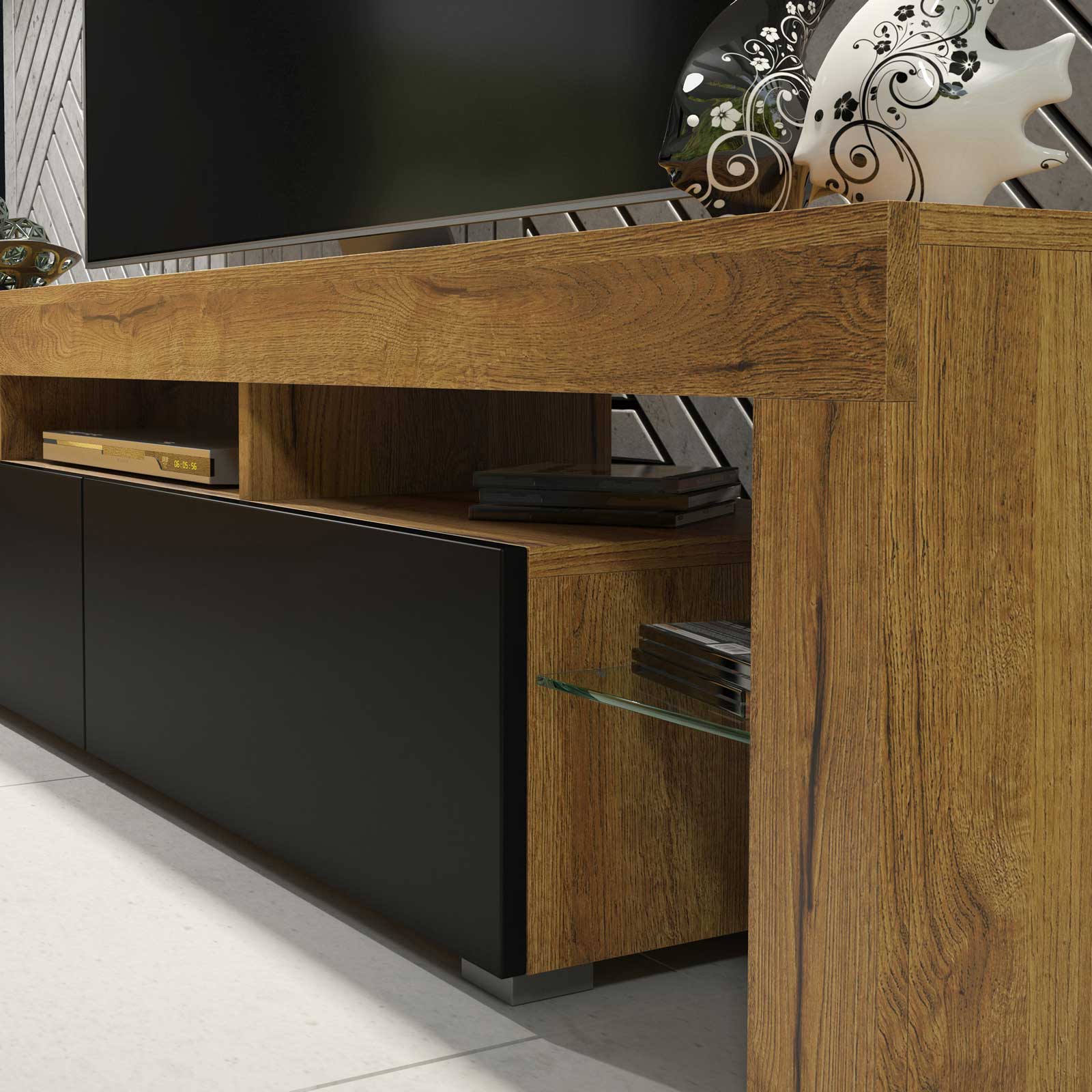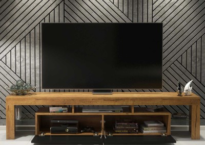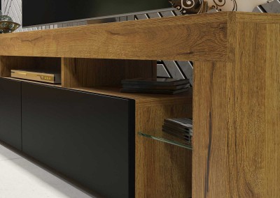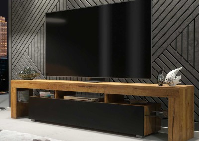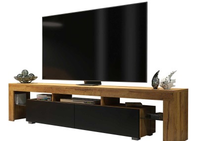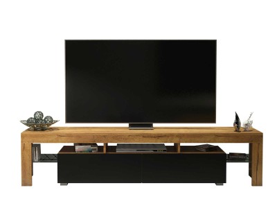 Add a natural touch to your interior with this stylish and functional TV unit, combining a warm oak matt body with bold black matt doors. Designed to suit both modern and industrial living rooms, this wide 200 cm cabinet provides practical storage and display in a sleek, contemporary form.