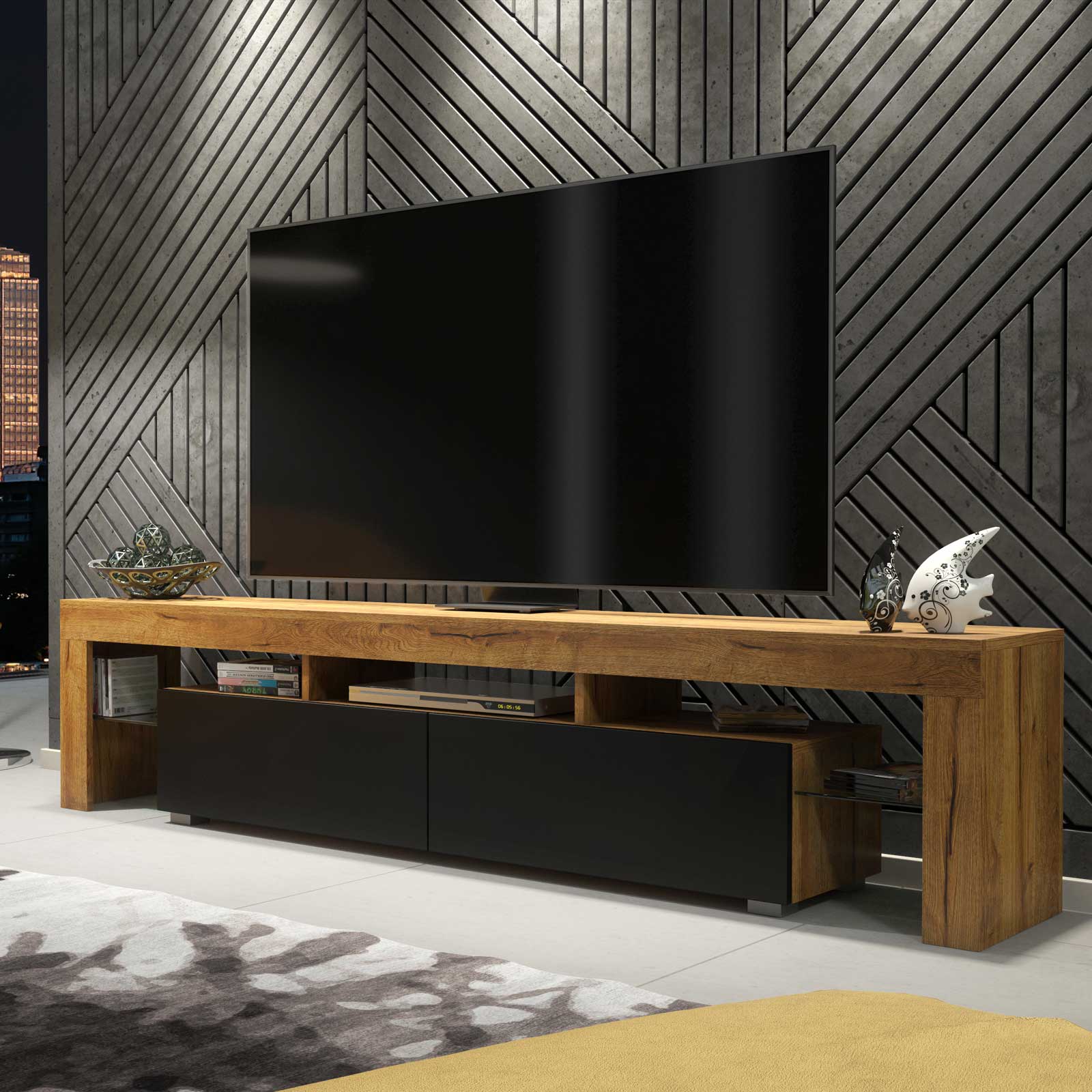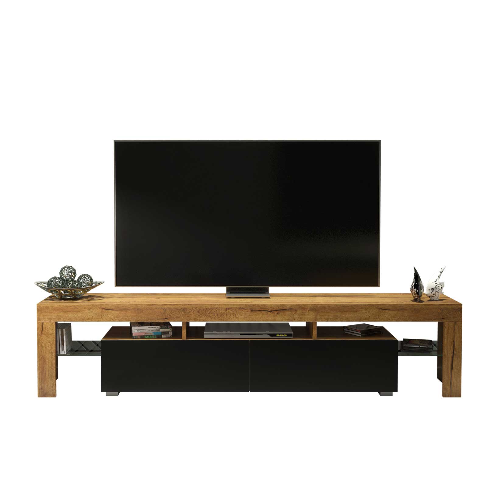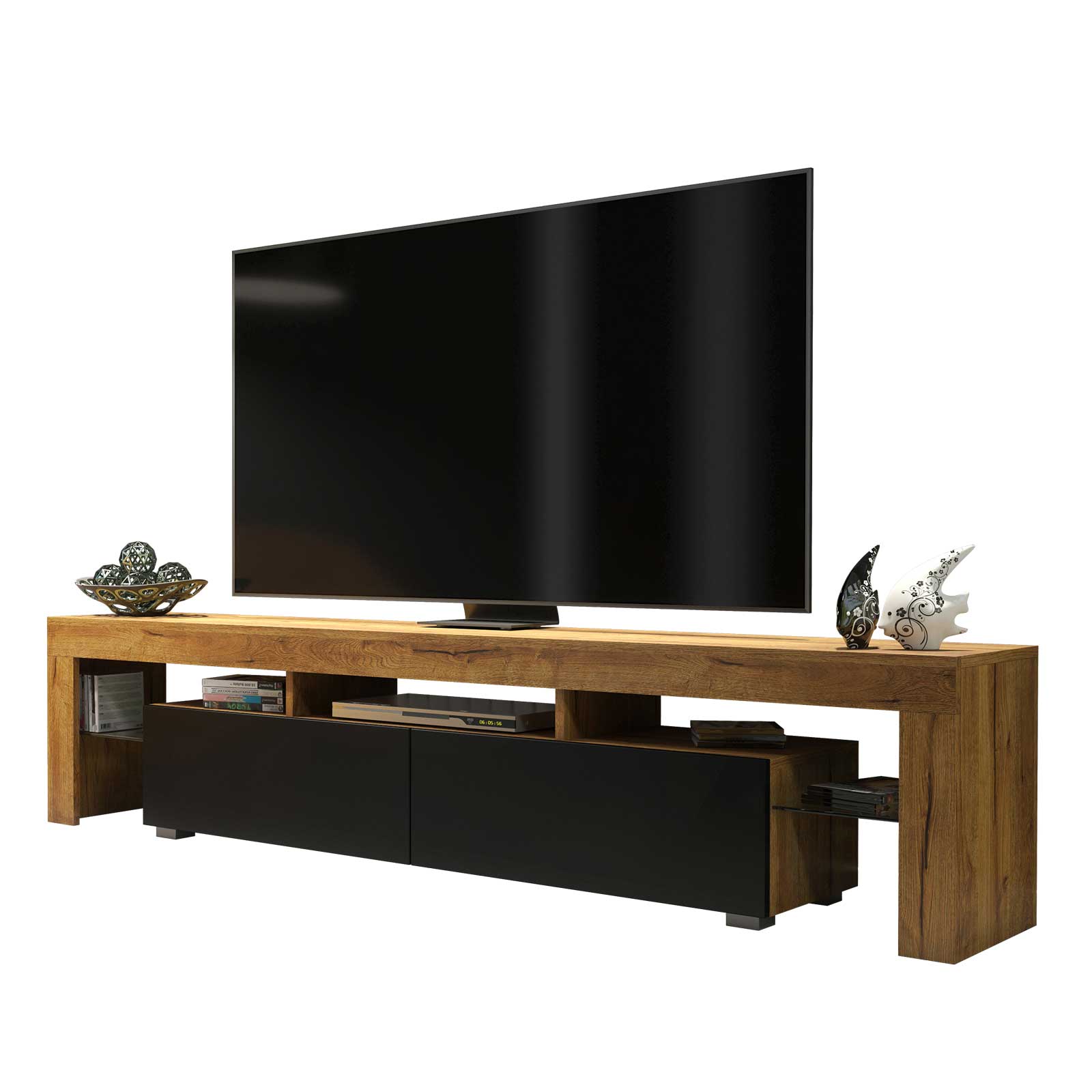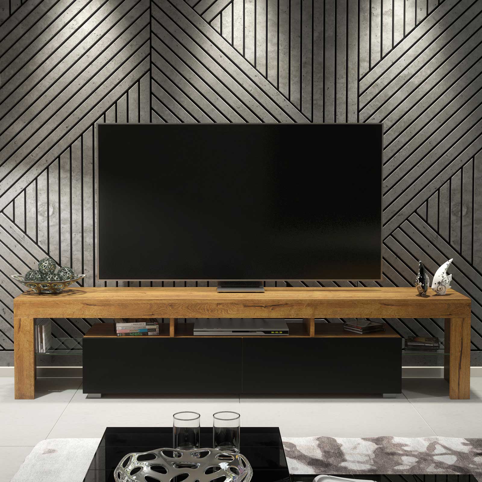 Modern Oak & Black TV Unit with Matt Doors – 200cm Media Cabinet