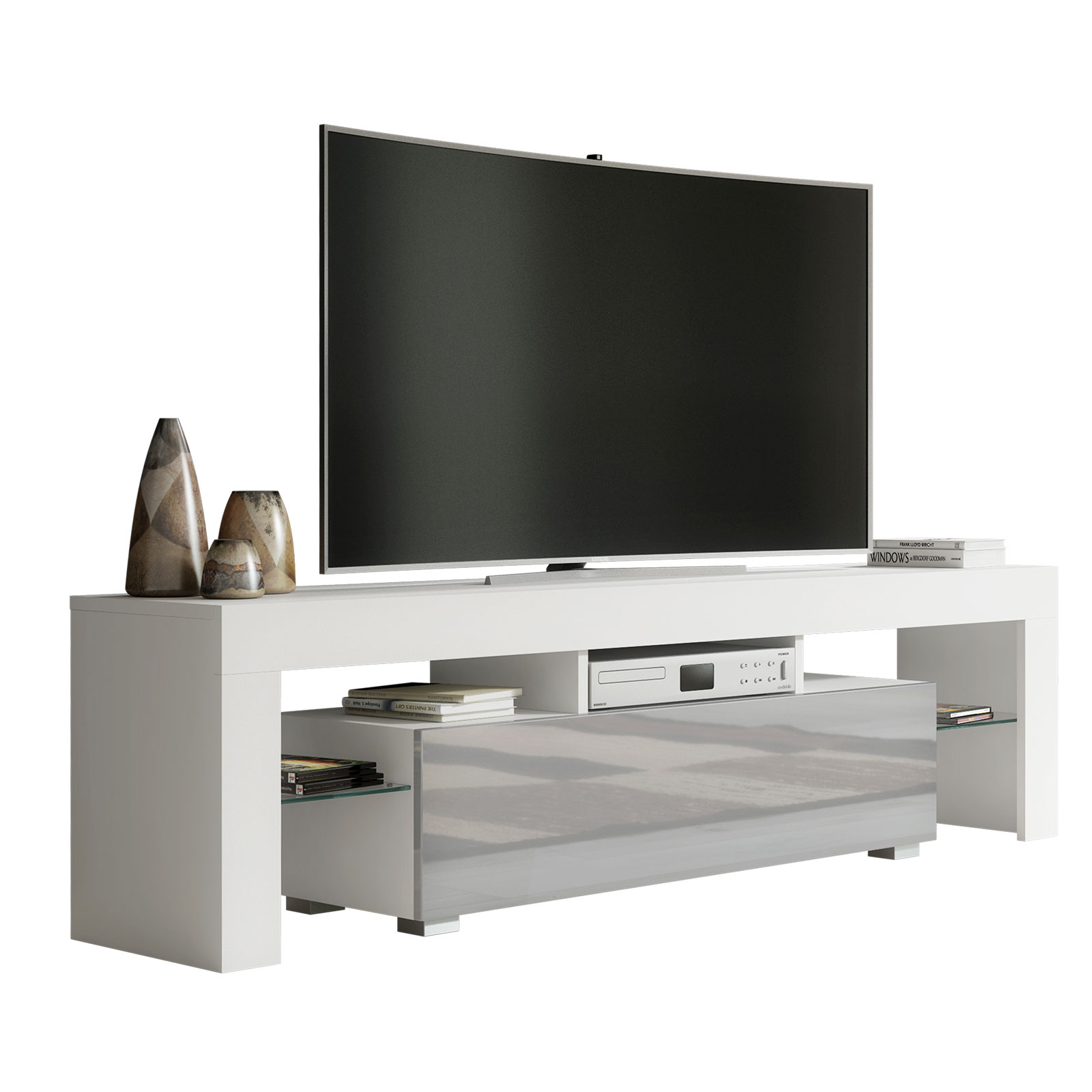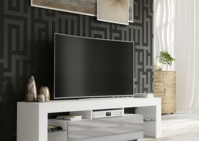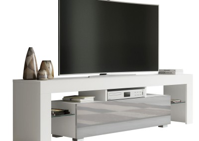Transform your living space with this modern 160 cm TV unit, perfectly combining clean lines, practical storage, and contemporary style. With its white matt body and sleek grey high gloss door, this cabinet is ideal for any minimalist or modern interior, offering both functionality and eye-catching design.