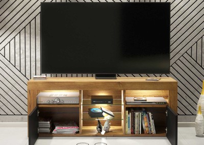 The unit features three spacious cupboards, offering ample concealed storage for consoles, remotes, DVDs, games and everyday essentials. The central tempered glass shelf provides the perfect space for multimedia devices such as set-top boxes, sound systems or gaming consoles.