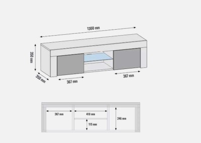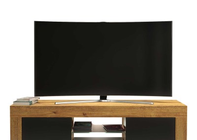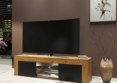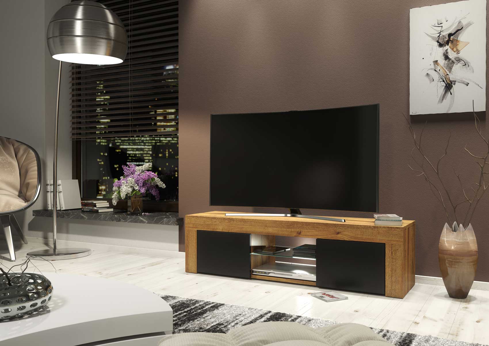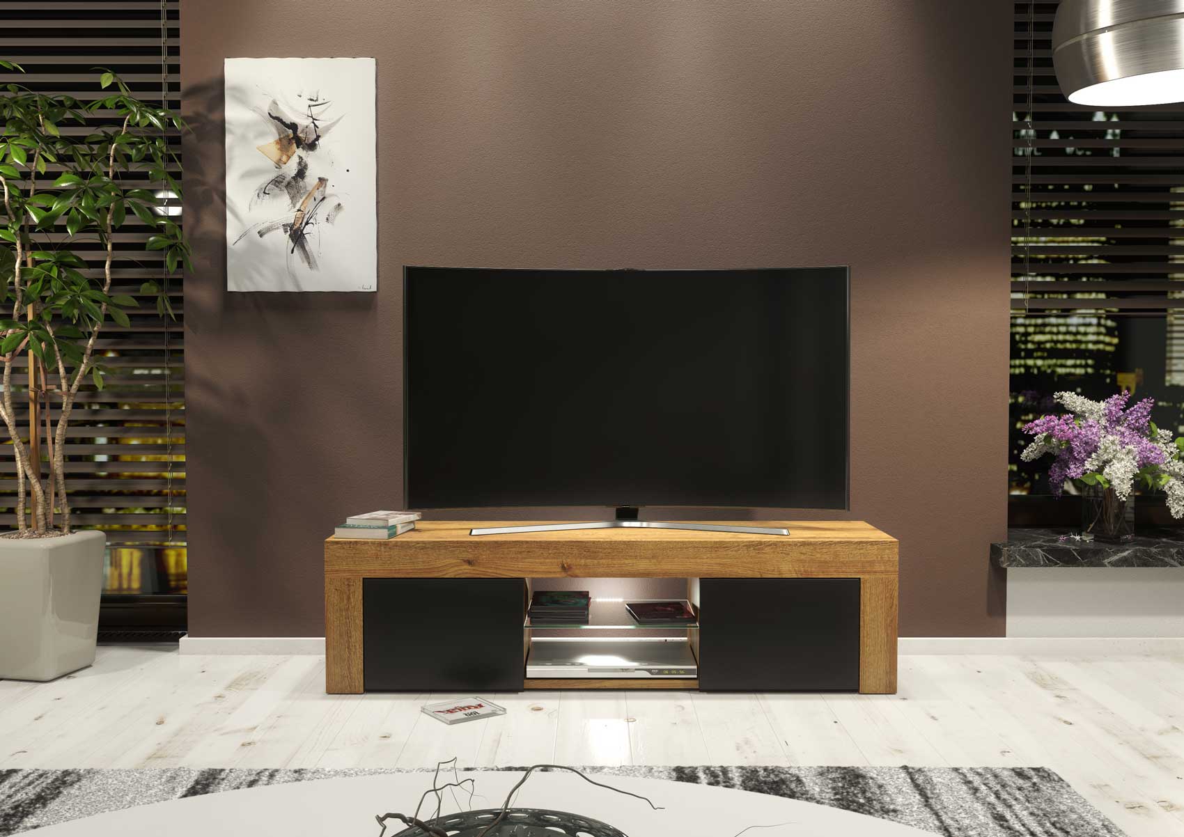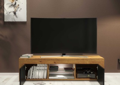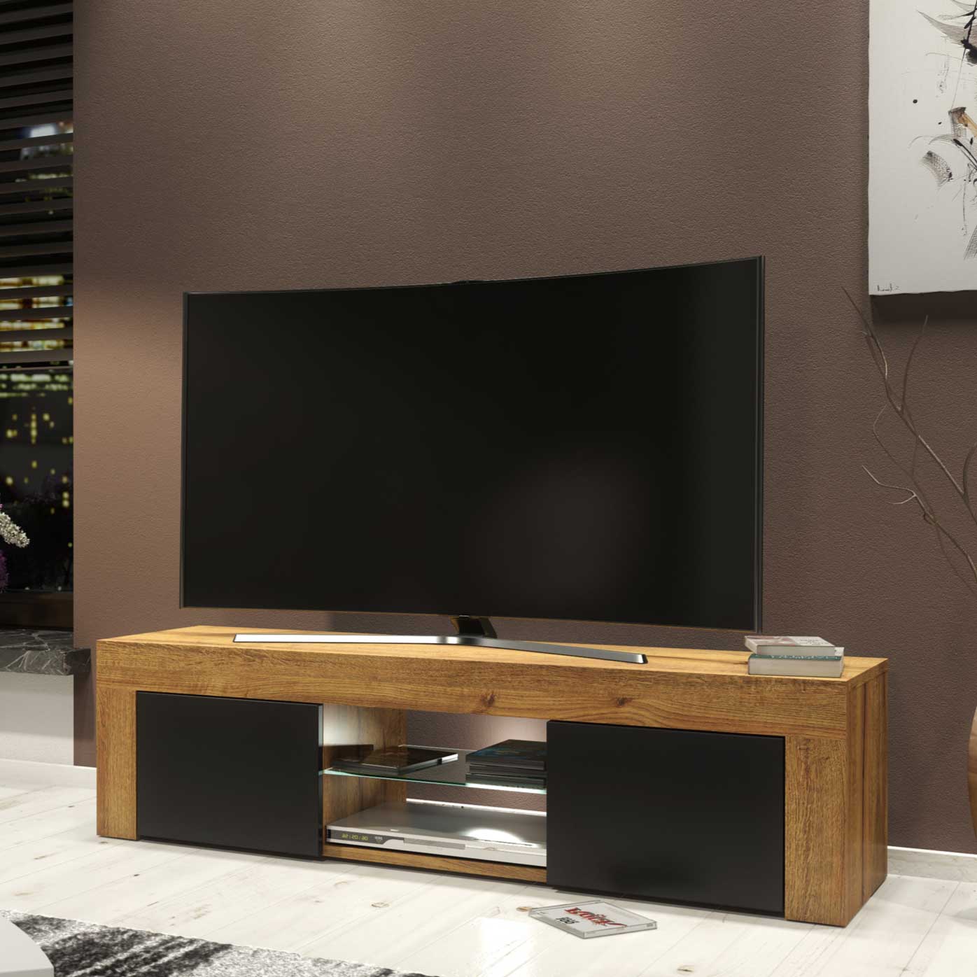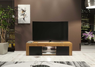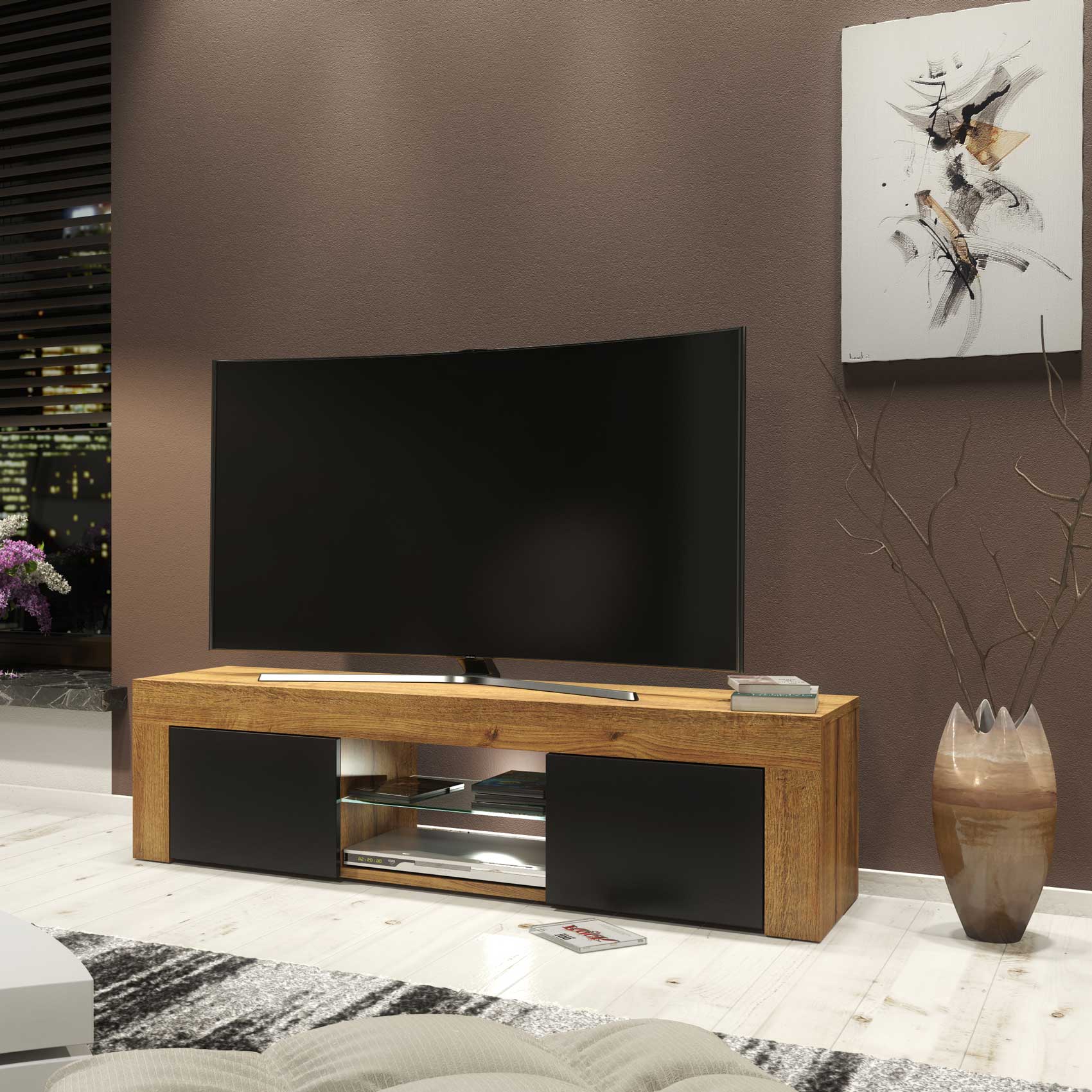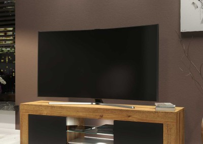 Modern TV Stand 130cm – Oak Matt Body & Black Matt Doors + White LED