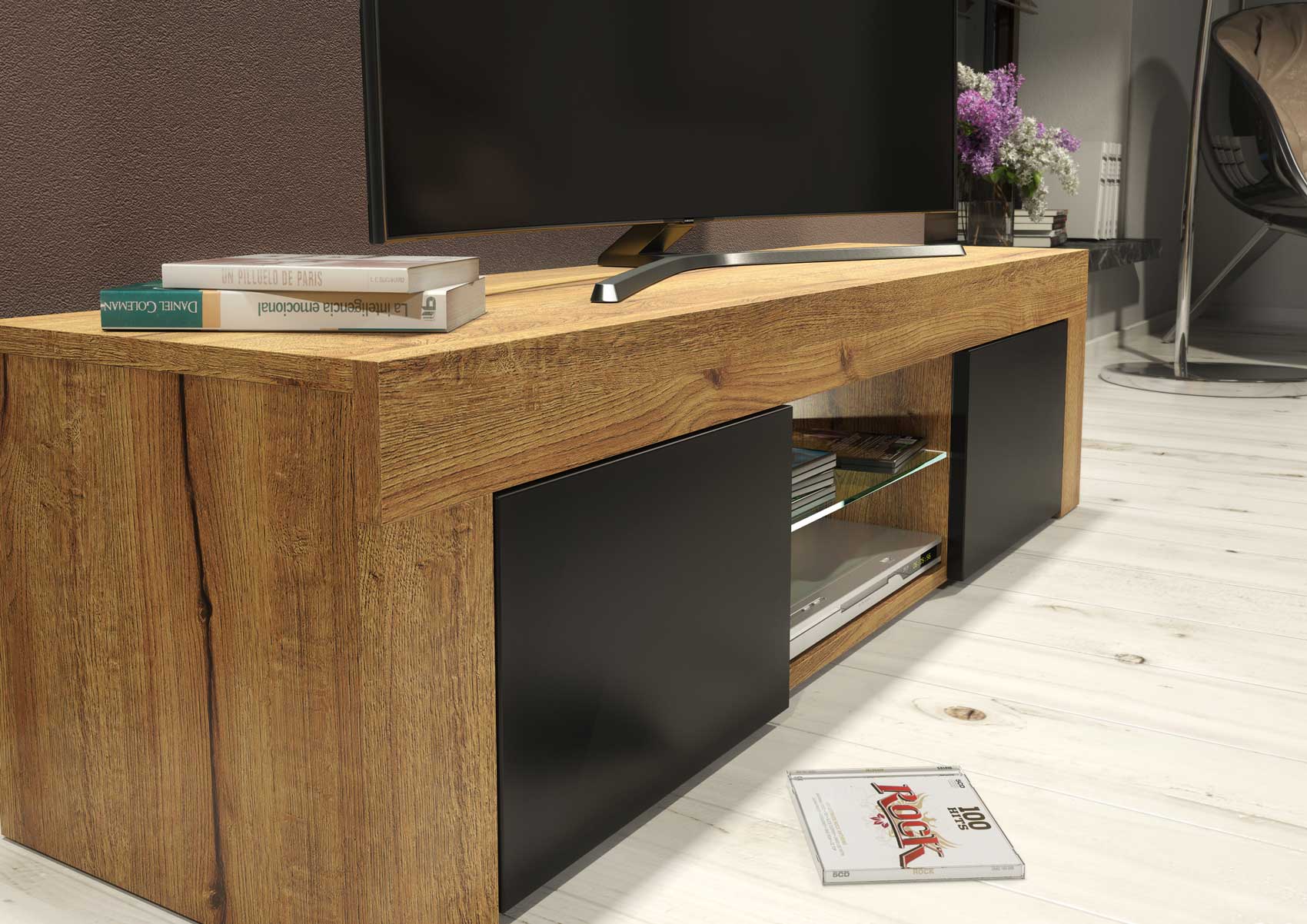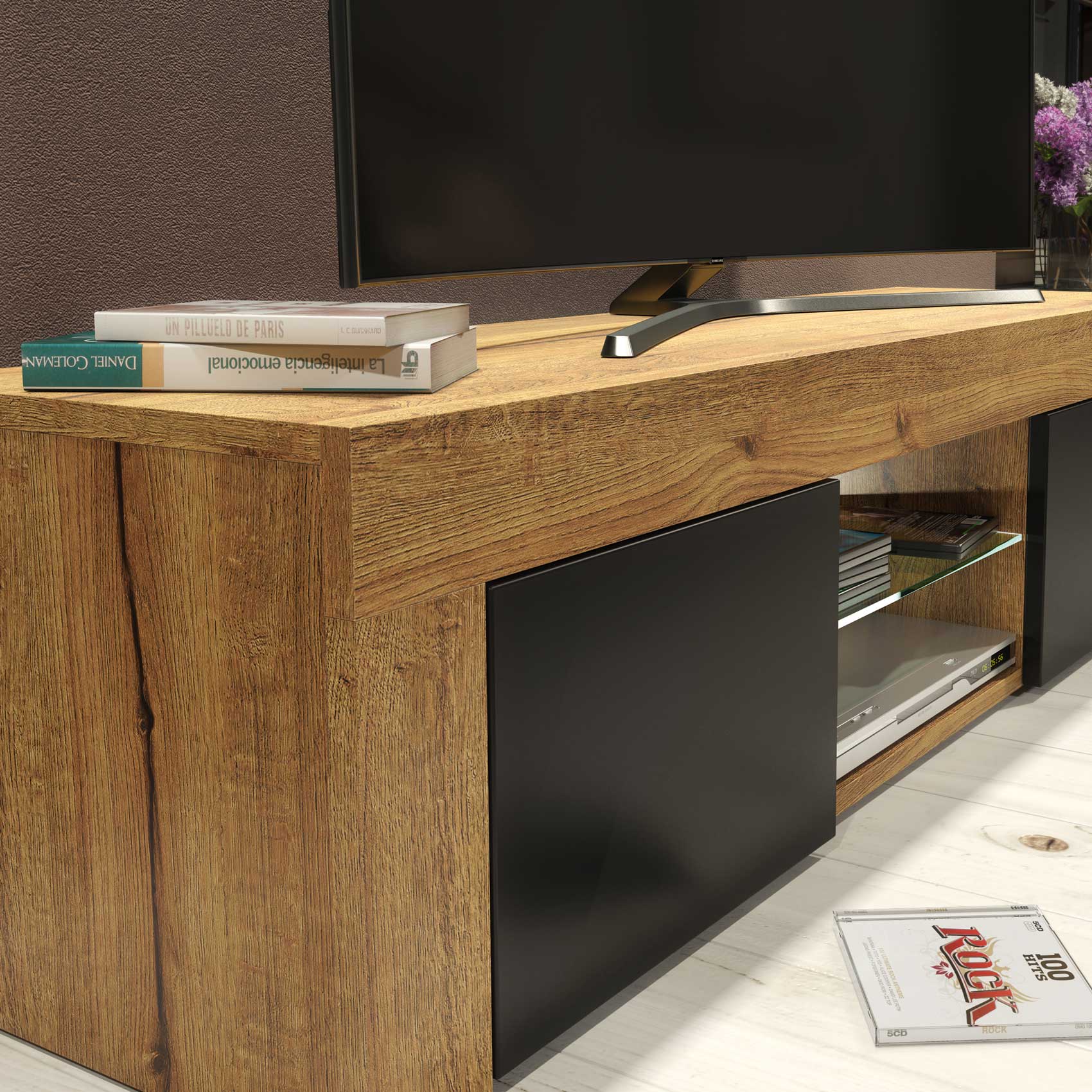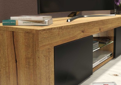 Bring a natural yet modern touch to your living room with this beautifully designed TV cabinet. Made from durable 16 mm MDF/chipboard, it perfectly blends high-quality materials with a bold, contemporary aesthetic. The oak matte body and black matte doors create a sophisticated contrast, making it a standout piece in any interior.