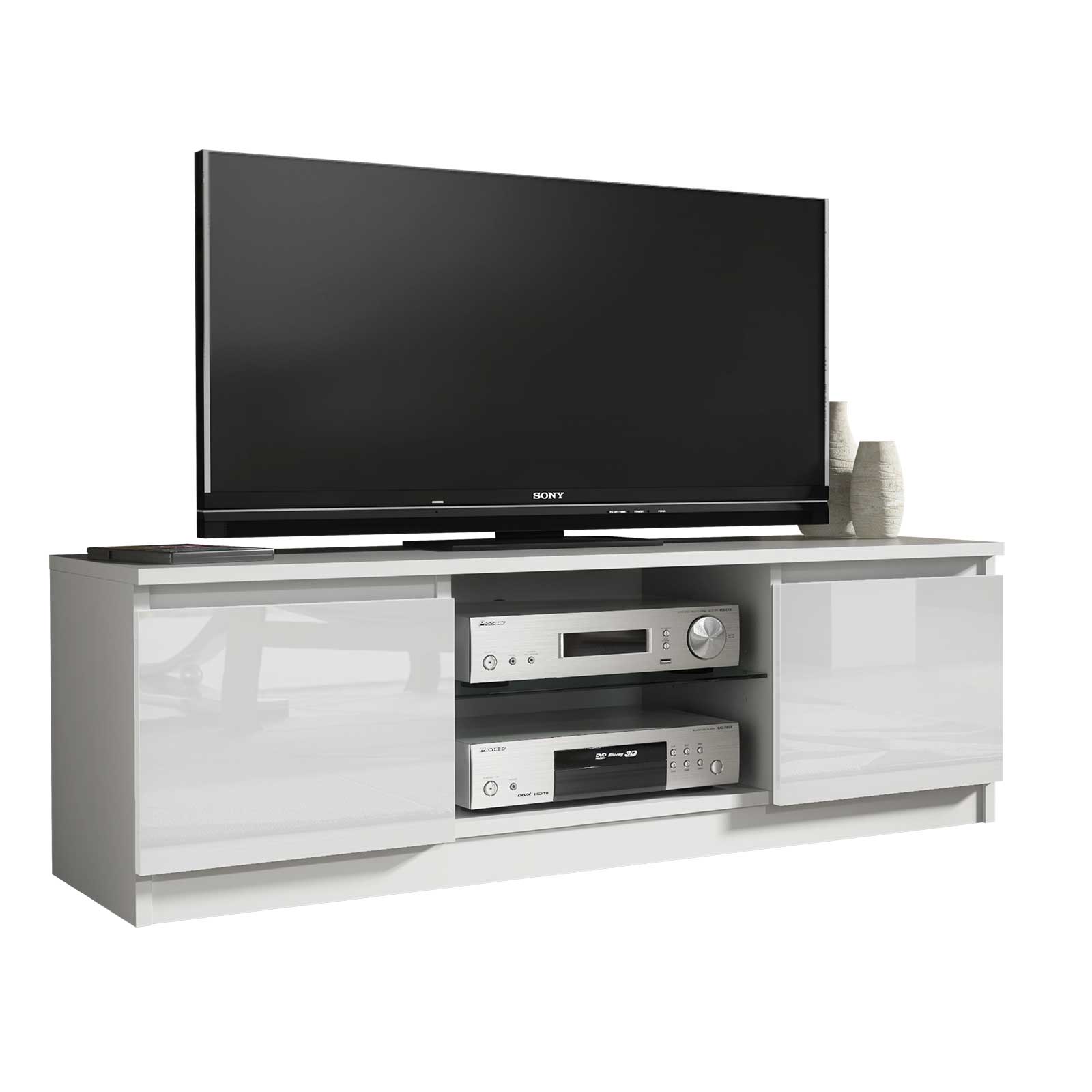 The cabinet offers two full-size side cupboards with glossy fronts, providing generous hidden storage to keep your electronics, DVDs, and accessories out of sight. The central open section includes a durable glass shelf, perfect for placing your media devices like game consoles, routers, or soundbars.