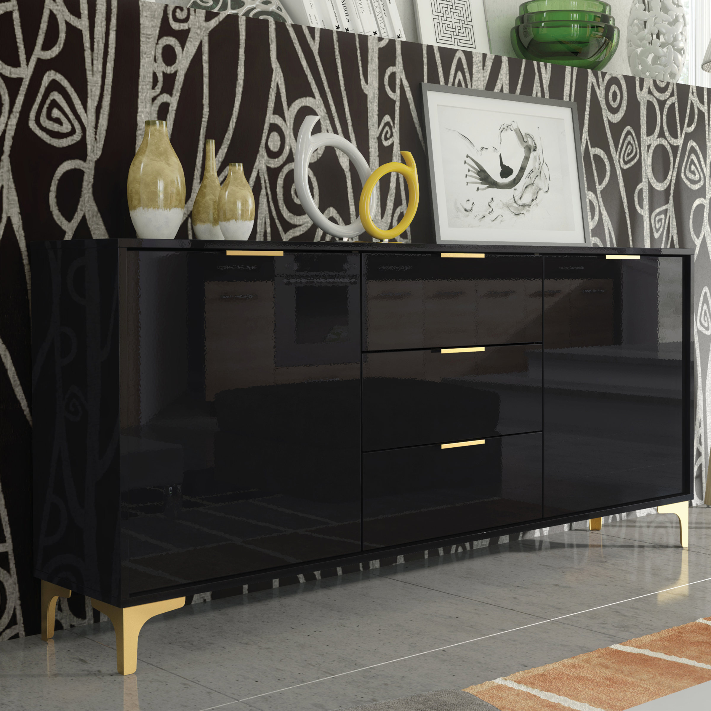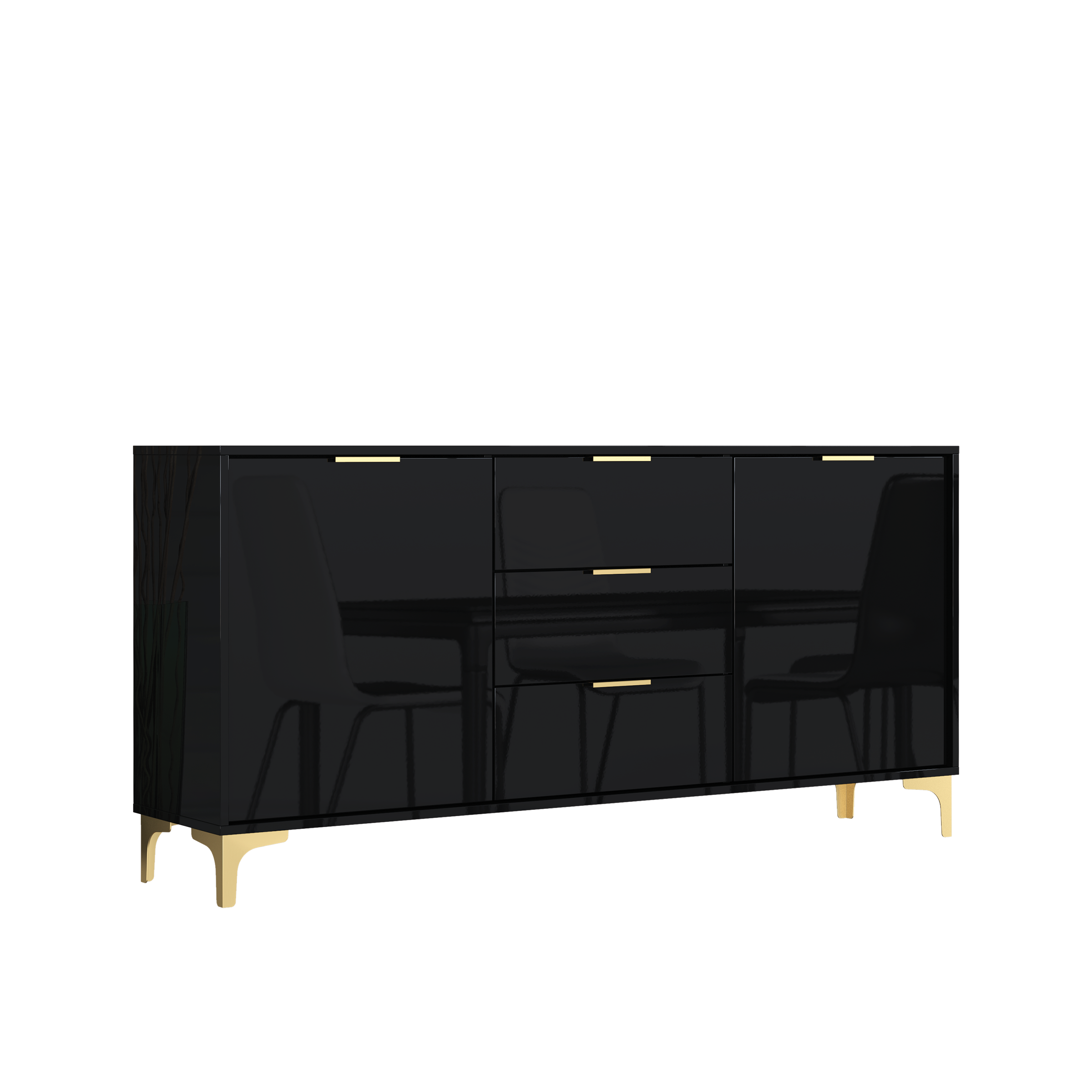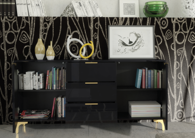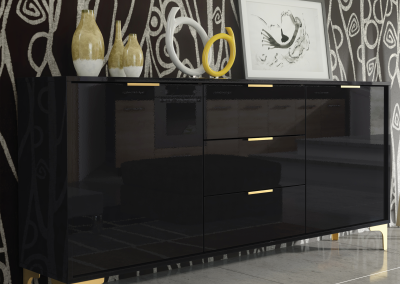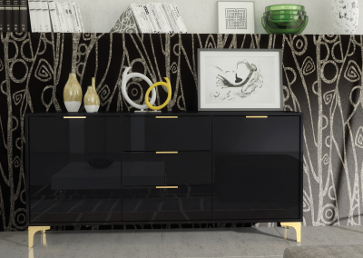 Make a bold statement with this elegant black high gloss sideboard – featuring golden legs and handles for a luxurious, modern finish that demands attention.