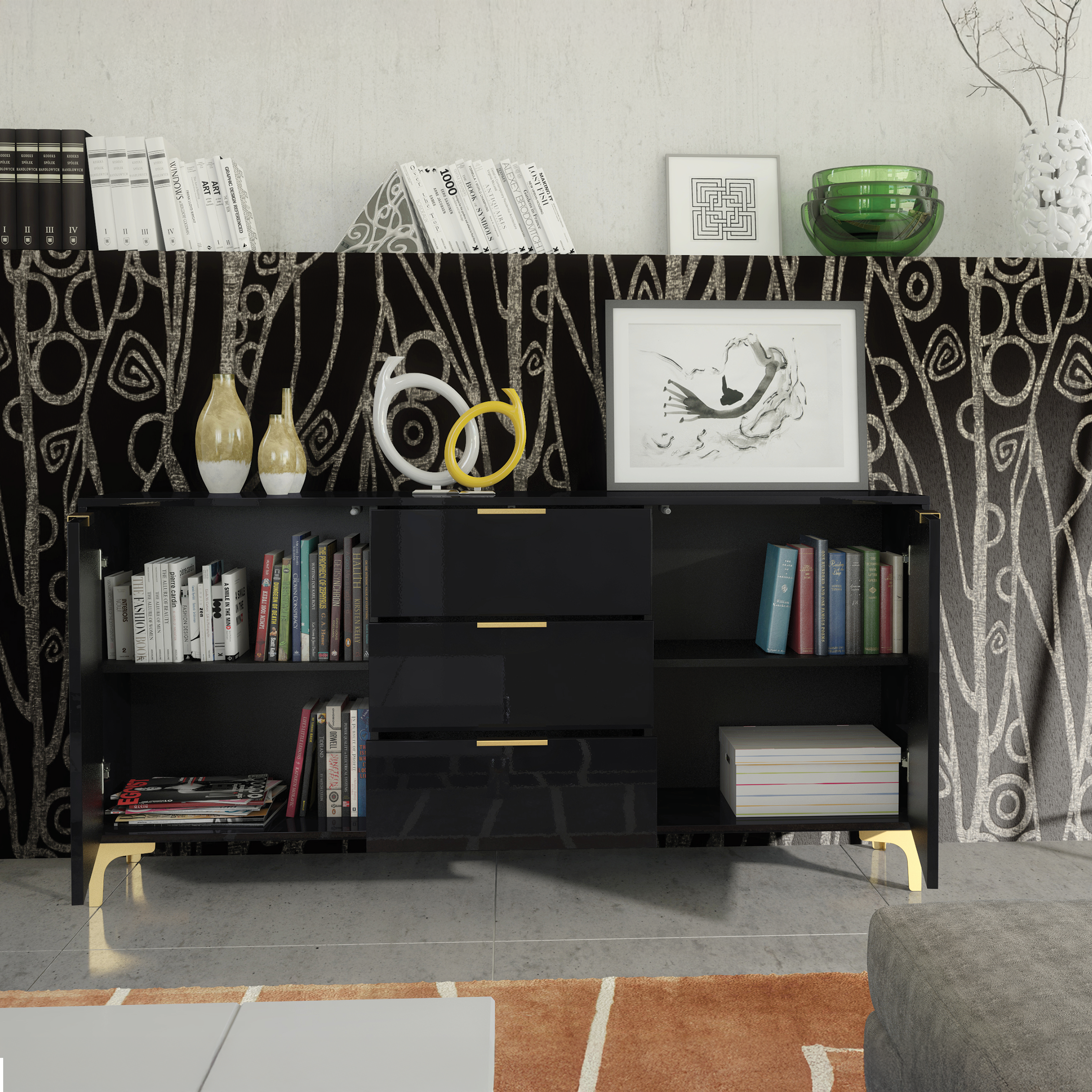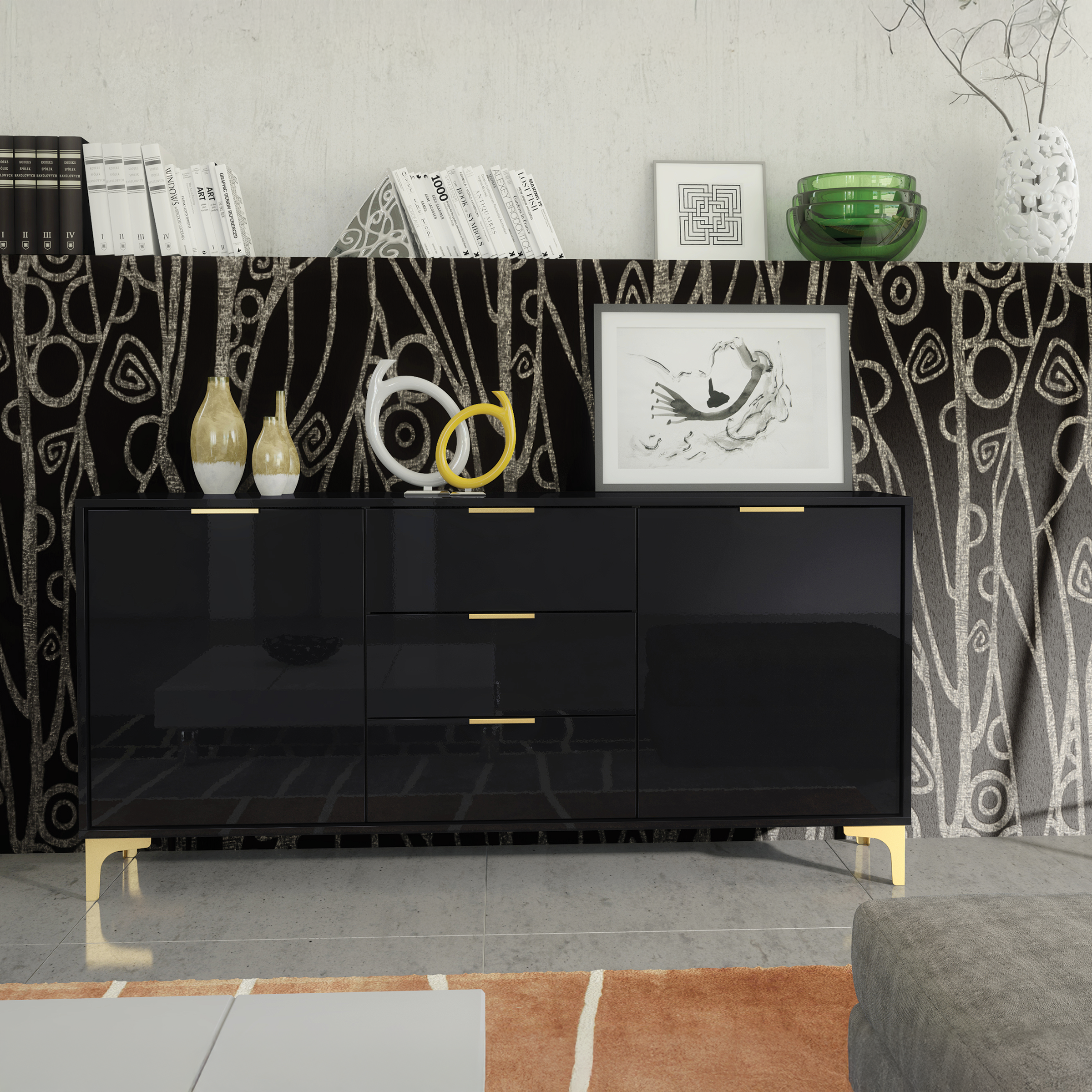 Designed to elevate your interior, this striking cabinet combines a deep full black gloss finish with refined golden metal accents. The sleek silhouette and handle-less fronts create a minimalist look, while the gold legs and slim handles add just the right touch of glam and contrast – perfect for contemporary, art-deco or chic interiors.