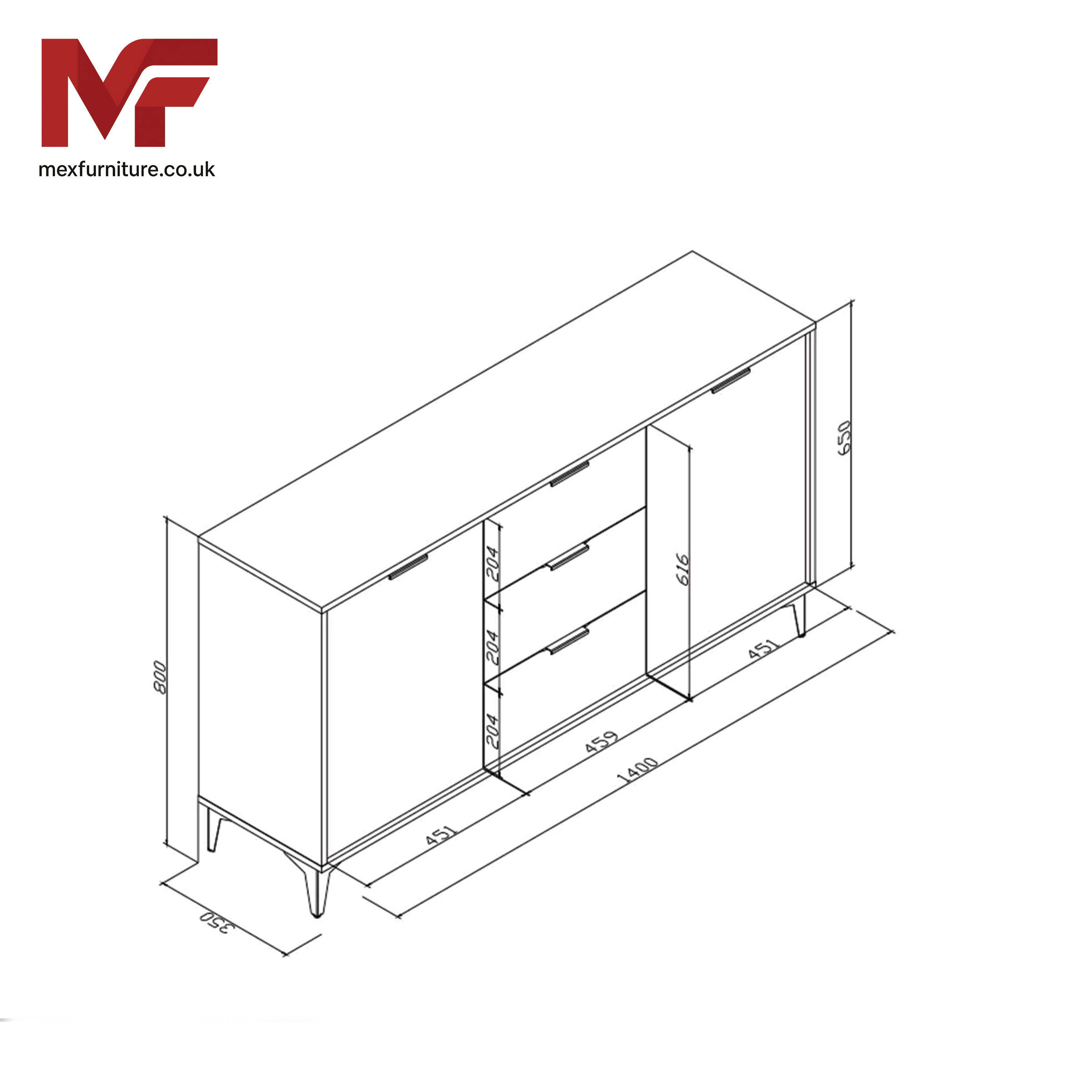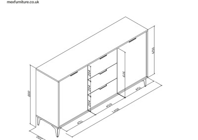Constructed from durable 16 mm laminated MDF/chipboard, this sideboard is as practical as it is beautiful. Inside, you’ll find two spacious cupboards with internal shelving – ideal for hidden storage – and three central drawers to keep your essentials neatly organized. Whether placed in a dining area, living room or hallway, this cabinet offers both functionality and eye-catching style.