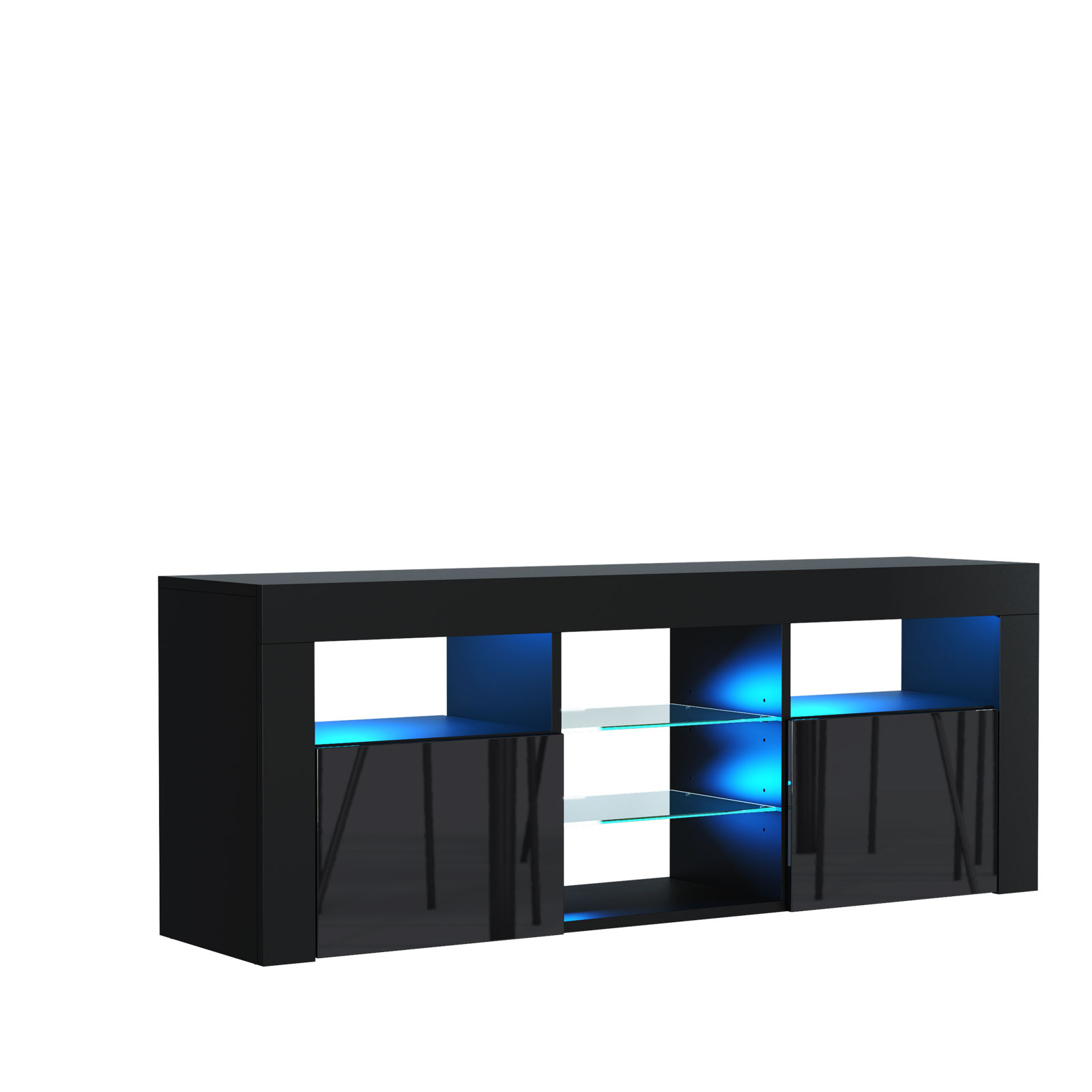 Built from durable 16 mm MDF/chipboard, this TV unit is made to last, offering sturdy support and a premium feel. The thoughtful storage design ensures that your entertainment area remains organised and clutter-free. With a wide glass shelf at the centre and three closed cupboards, this piece accommodates multimedia devices, remotes, and living room essentials with ease. The free LED lighting provides a subtle ambient glow that highlights the design and elevates the atmosphere of your space, especially during the evenings.