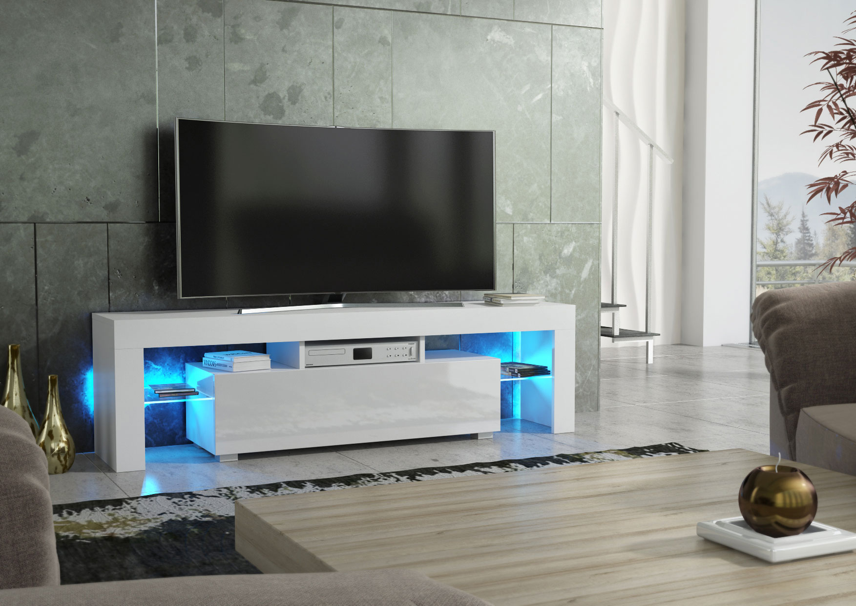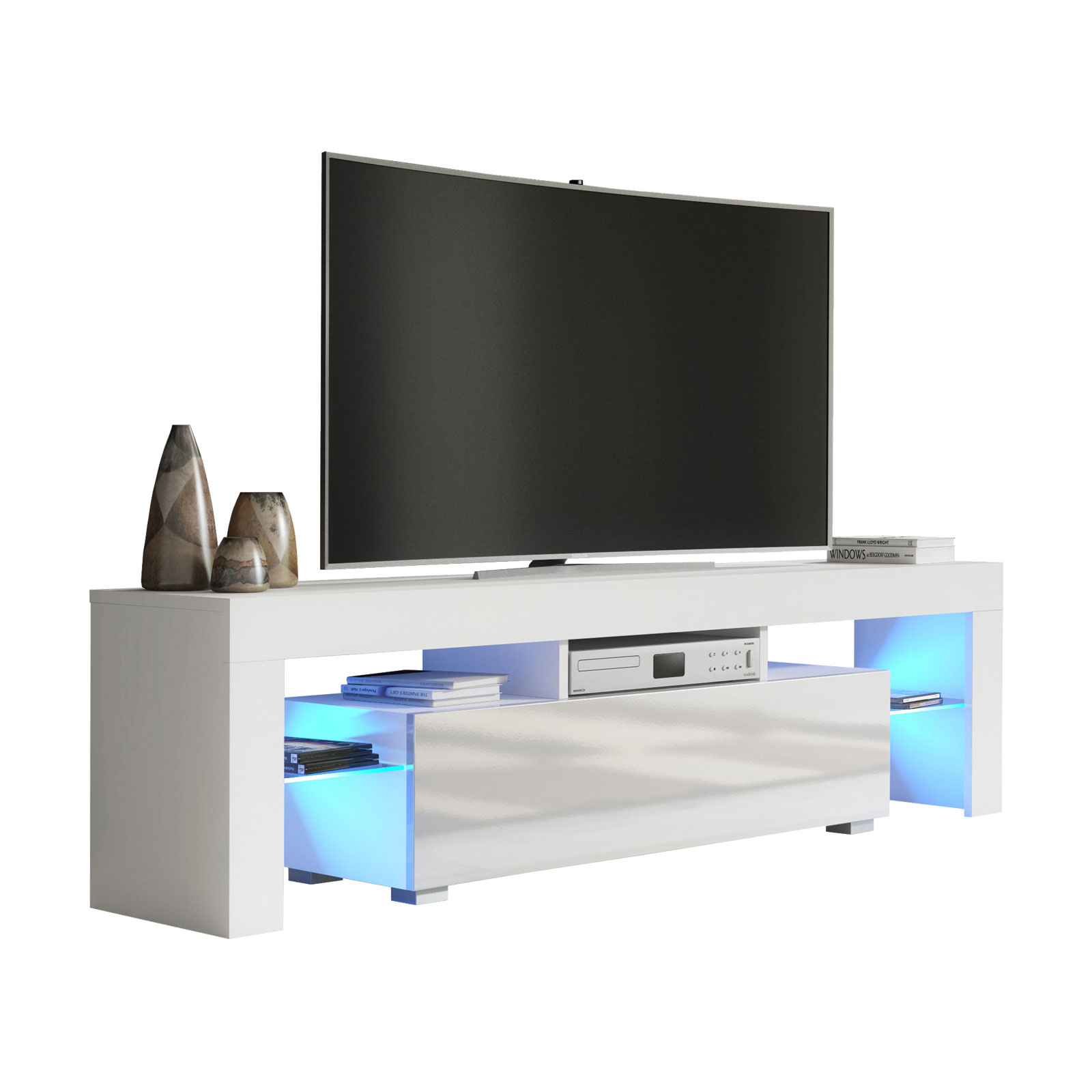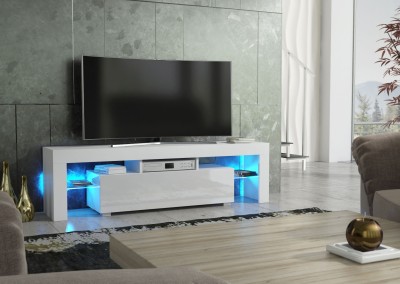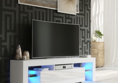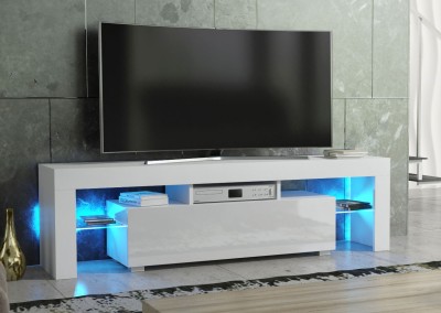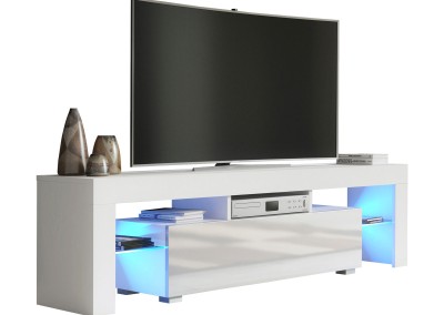Elevate your entertainment setup with this contemporary white TV unit, combining premium materials, ambient lighting, and modern form – a perfect choice for stylish interiors.
