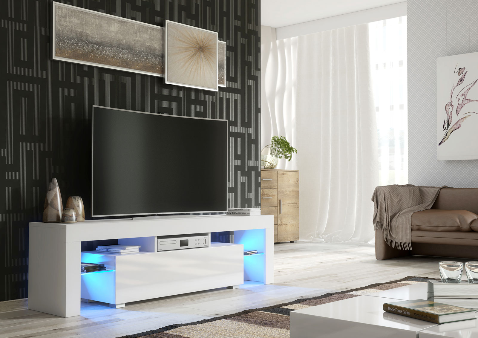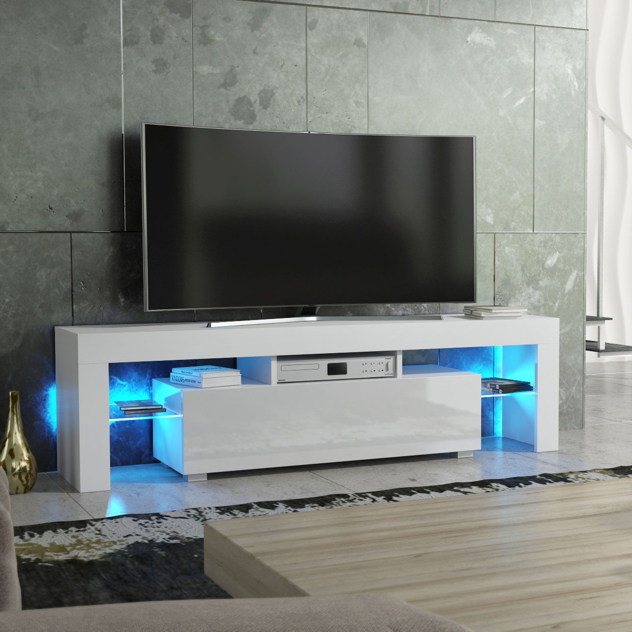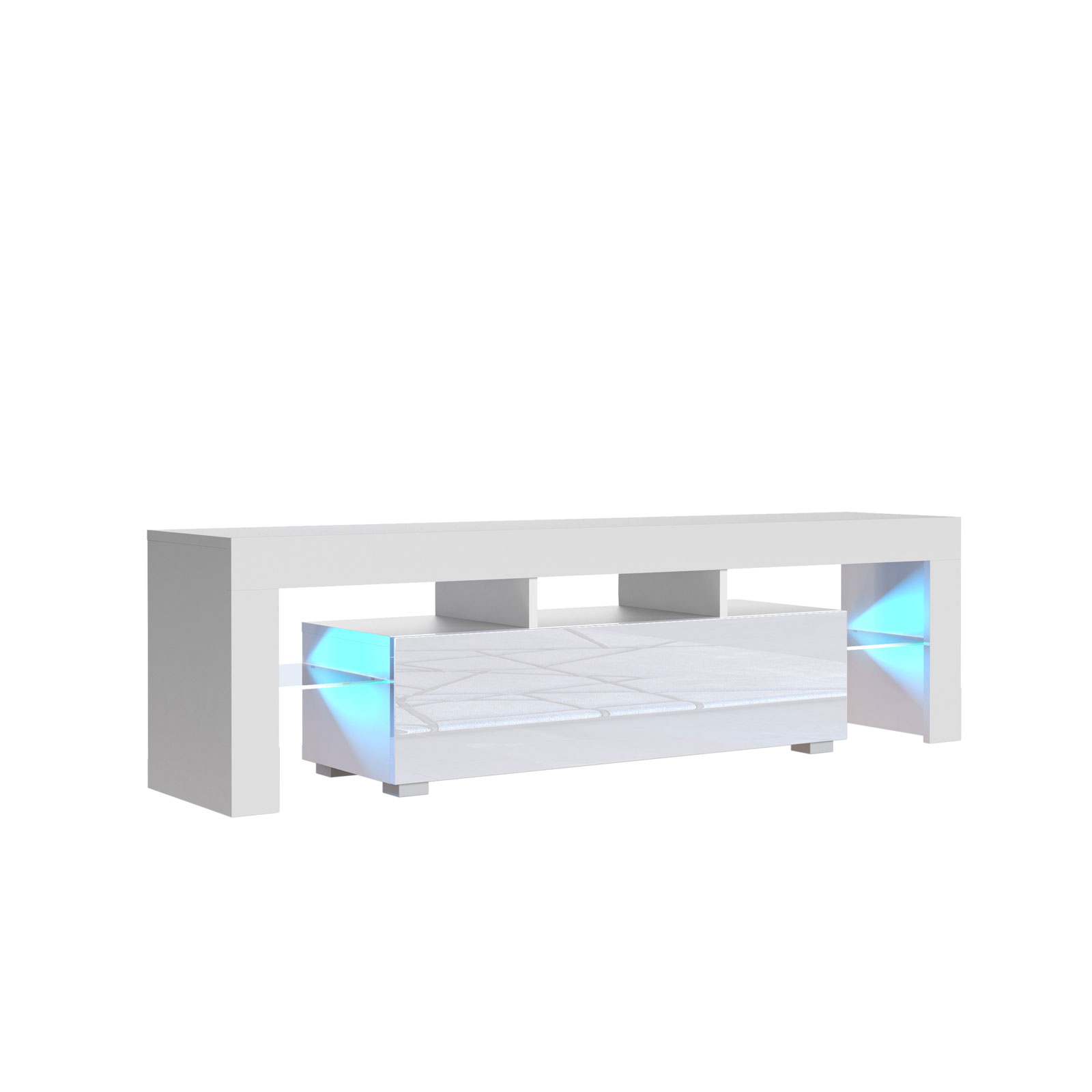 Elevate your entertainment setup with this contemporary white TV unit, combining premium materials, ambient lighting, and modern form – a perfect choice for stylish interiors.