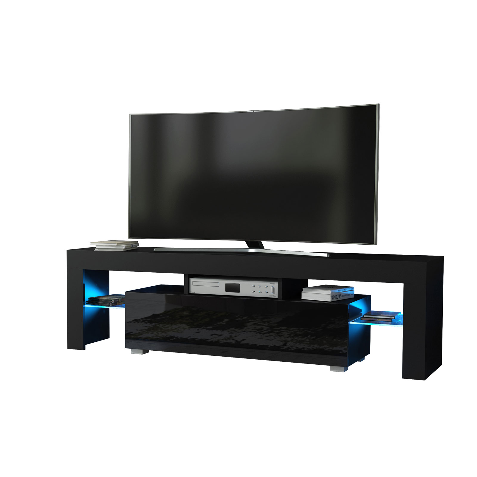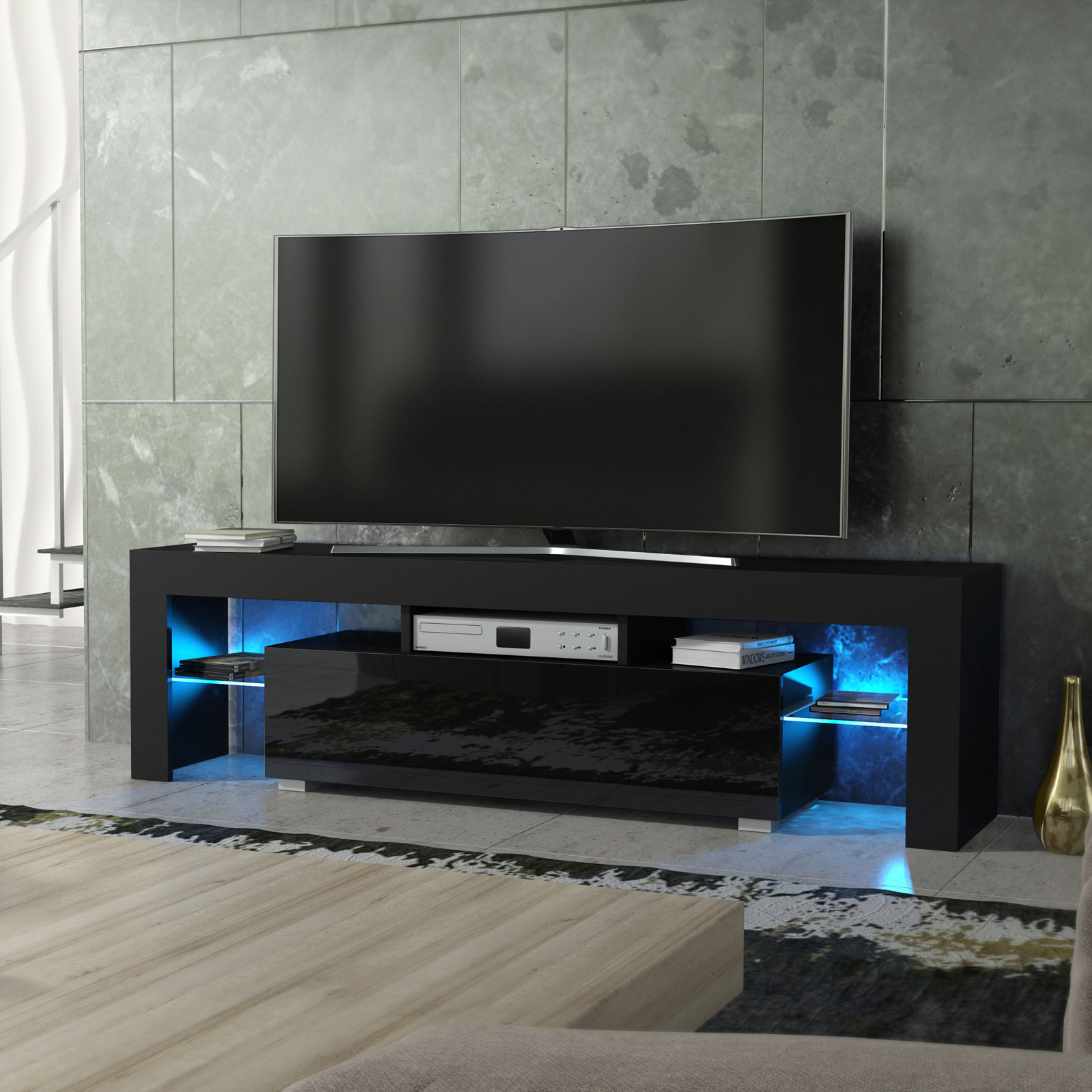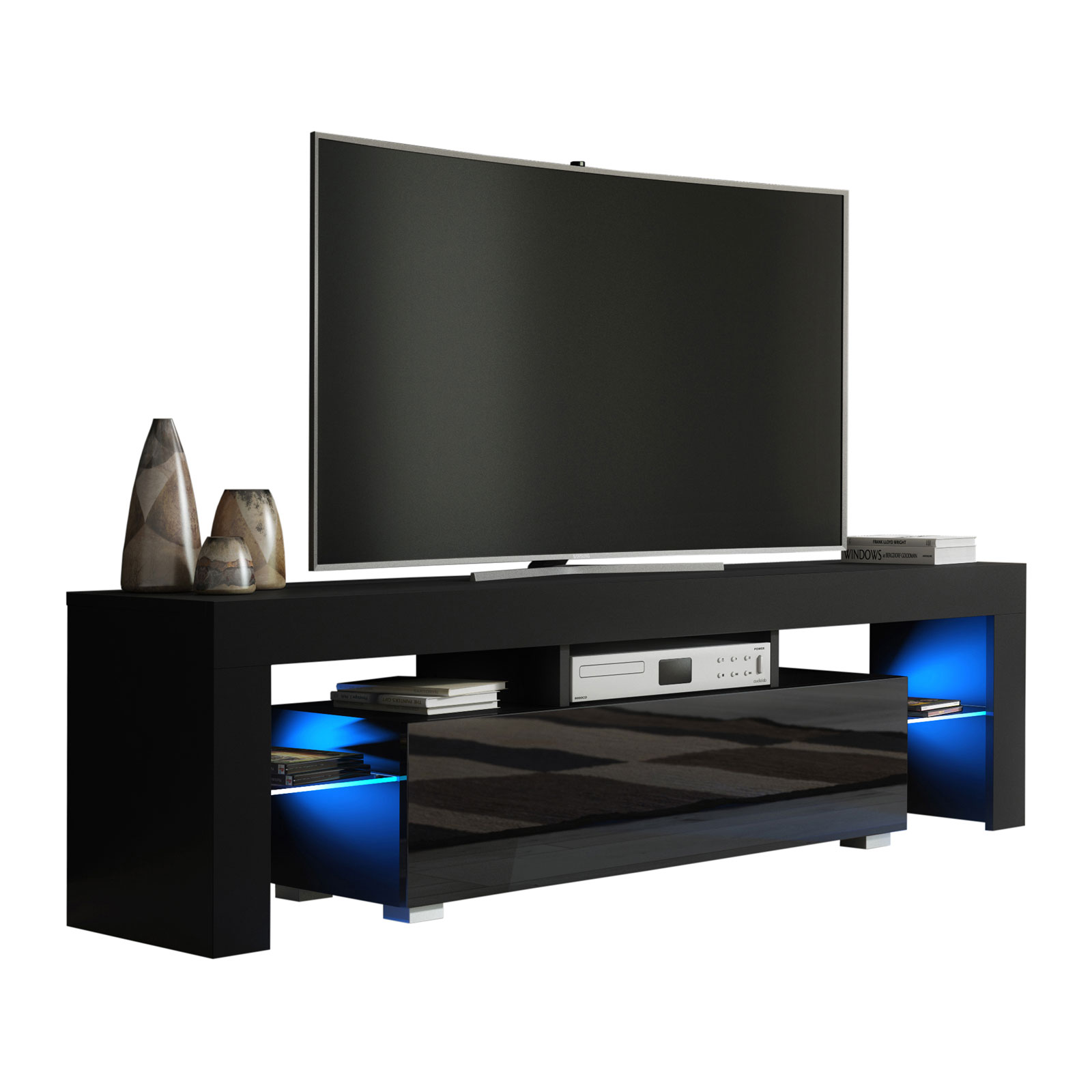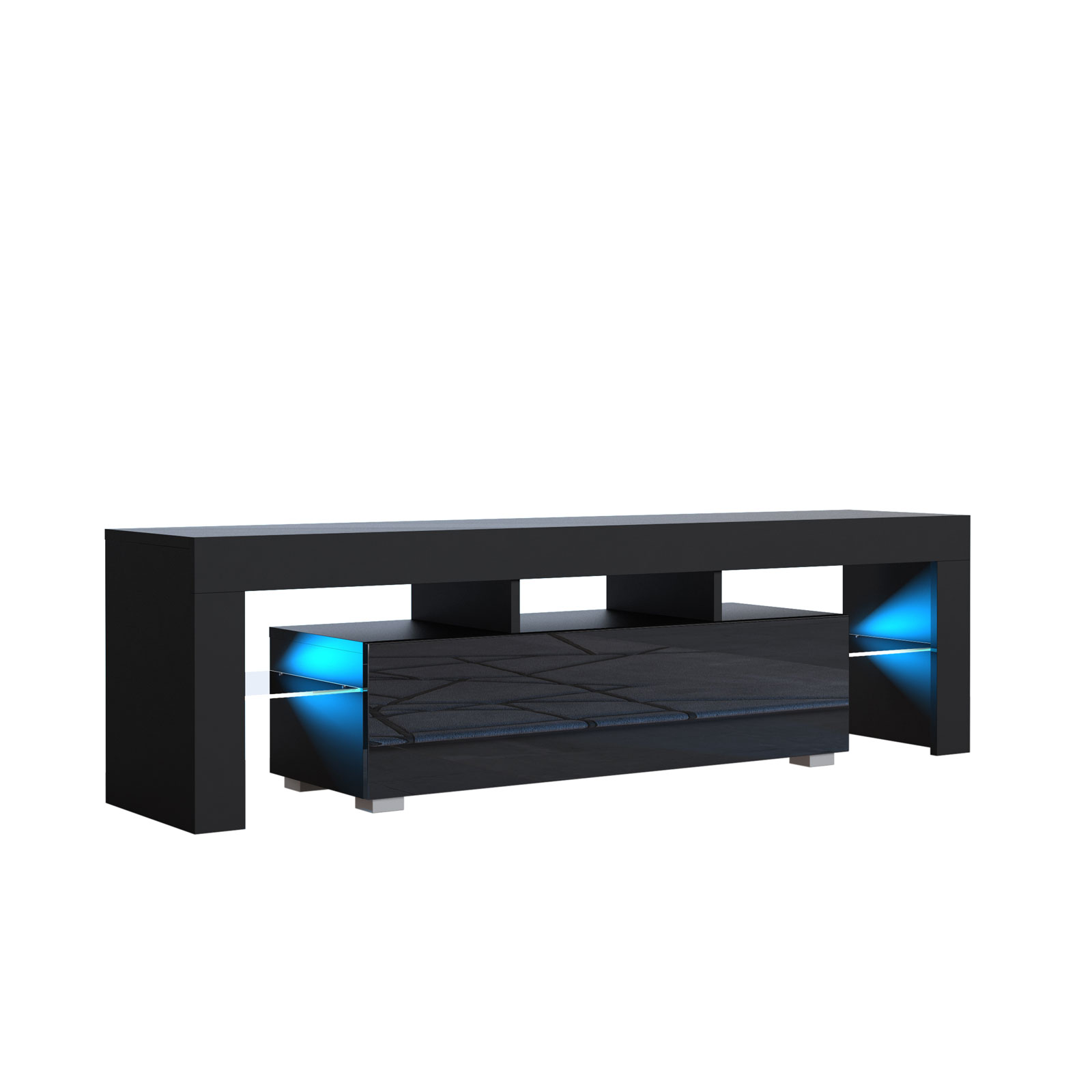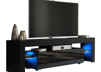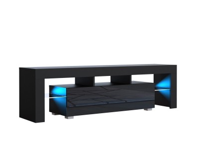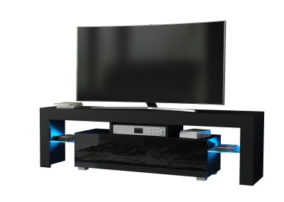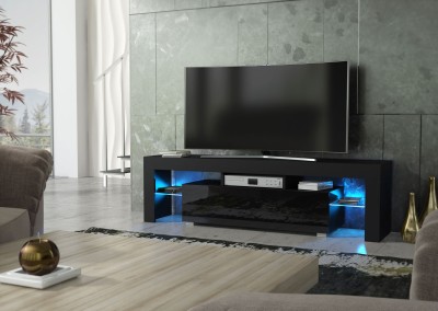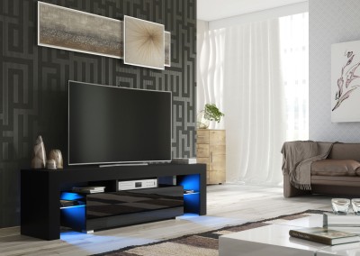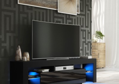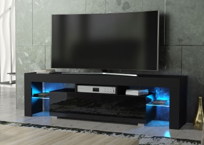 Bring bold contrast and ambient elegance into your living room with this modern 160 cm TV unit, featuring a black matt body and a sleek black high gloss door. The combination of dark tones and reflective surfaces gives this cabinet a strong contemporary presence. Enhanced by free LED lighting, it adds a warm, ambient glow to elevate your space.